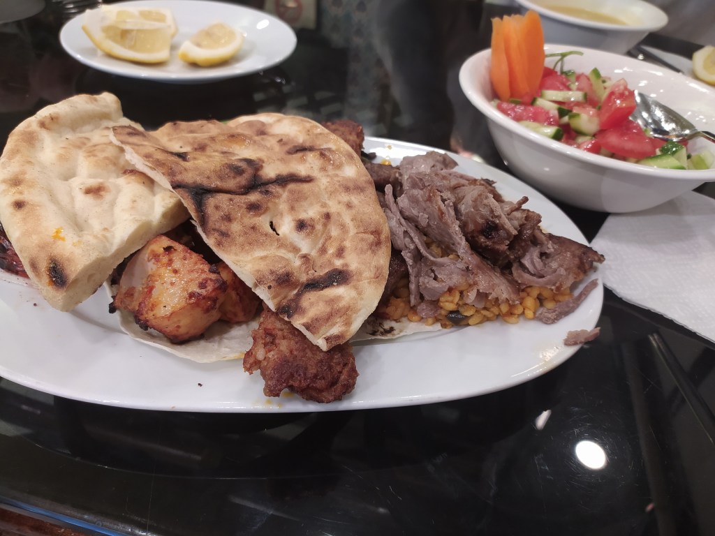 Once we checked it, it was time to eat: my mom and I both hadn’t eaten since the meager plane meal. The helpful receptionist told us that finding a good place that locals ate at was a quick five minute walk, which turned out to be one street wtih restaurants on both sides. However, the one thing that we’d totally forgotten was that, this being during Ramadan, everybody was coming out to eat after the breaking of the fast. Whoops! We had to circle around the strip a bit before ultimately settling on a place that looked like they had some room for us. Once inside, we spotted a table that was free, but the hostess told us it was reserved. However, it turned out that they were running late, so the space was given to us under the condition that we’d move over once they showed up. This arrangement worked for us, and we were soon tucking into the fresh-off-the-grill meat, as you can see in the picture below. It didn’t take long before the people with the reservation showed up, but they were two very amiable Egyptians who happily shared the space with us. We chatted over the food, and we soon learned that they lived in London but visited Istanbul quite often and had made this restaurant their go-to whenever they were in town. Eventually it was time to leave, and we were able to finally get relax for the day. All in all, it was an interesting introduction to both Istanbul and Turkey that left us excited to see what else was around!